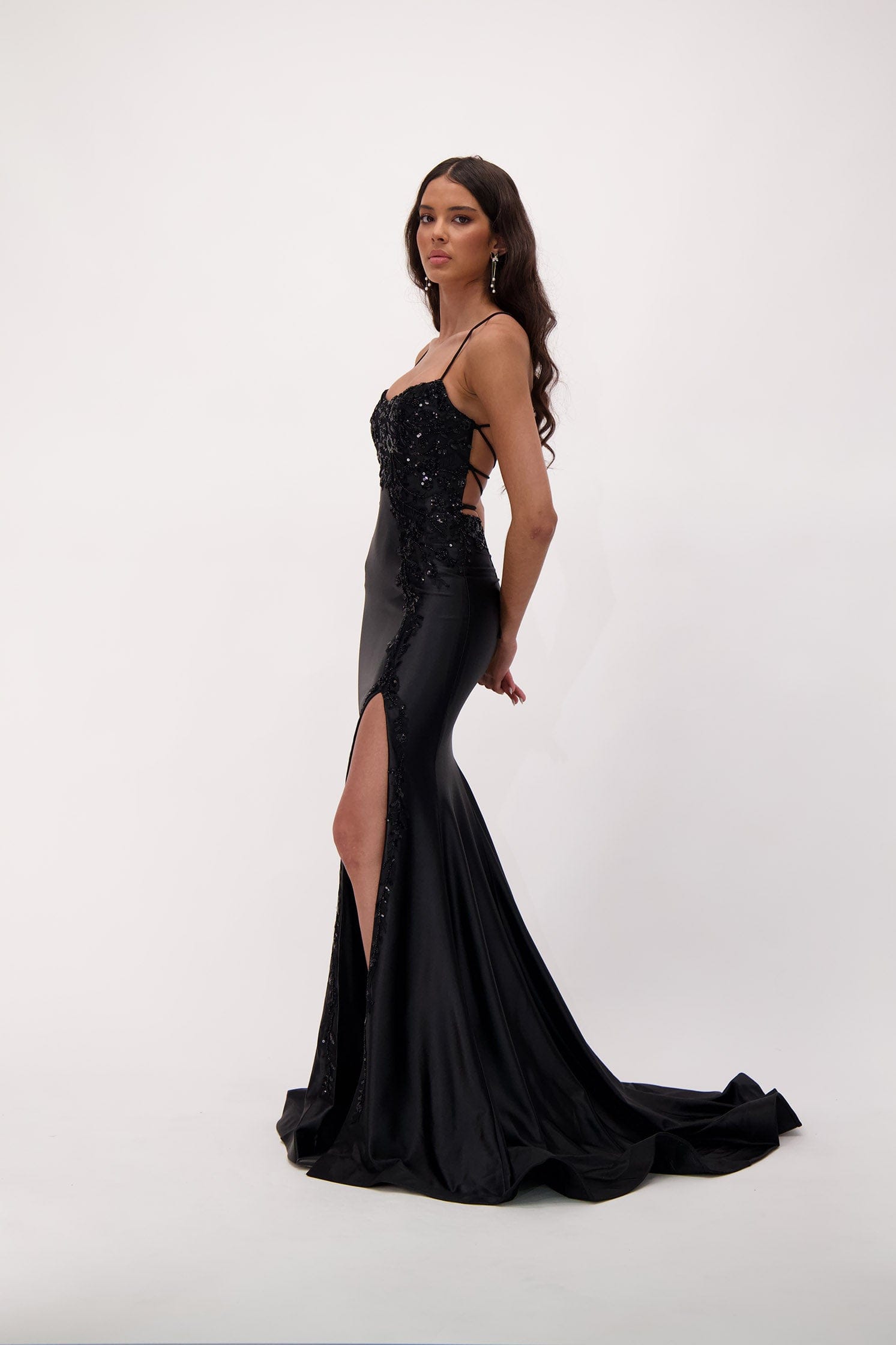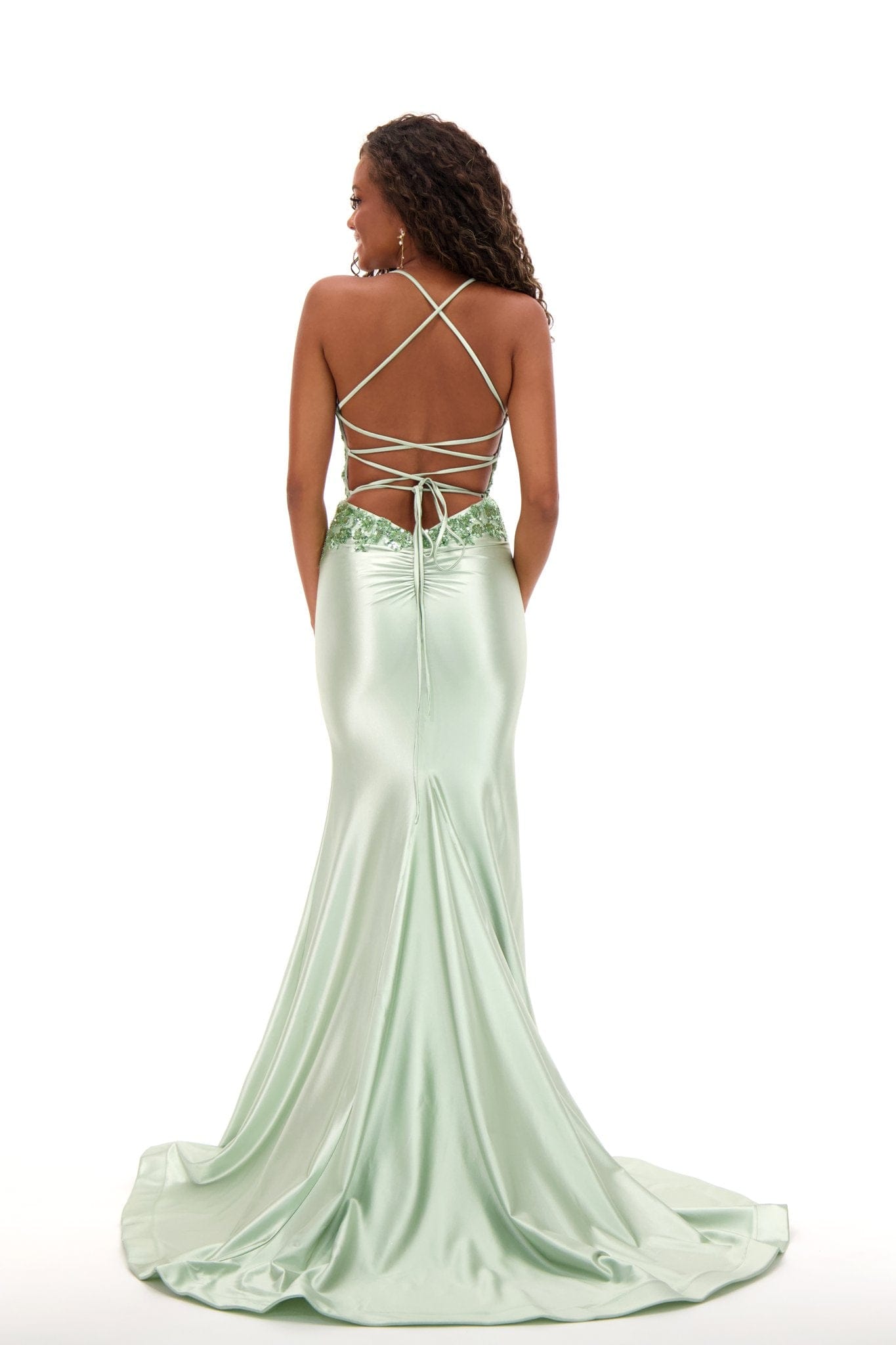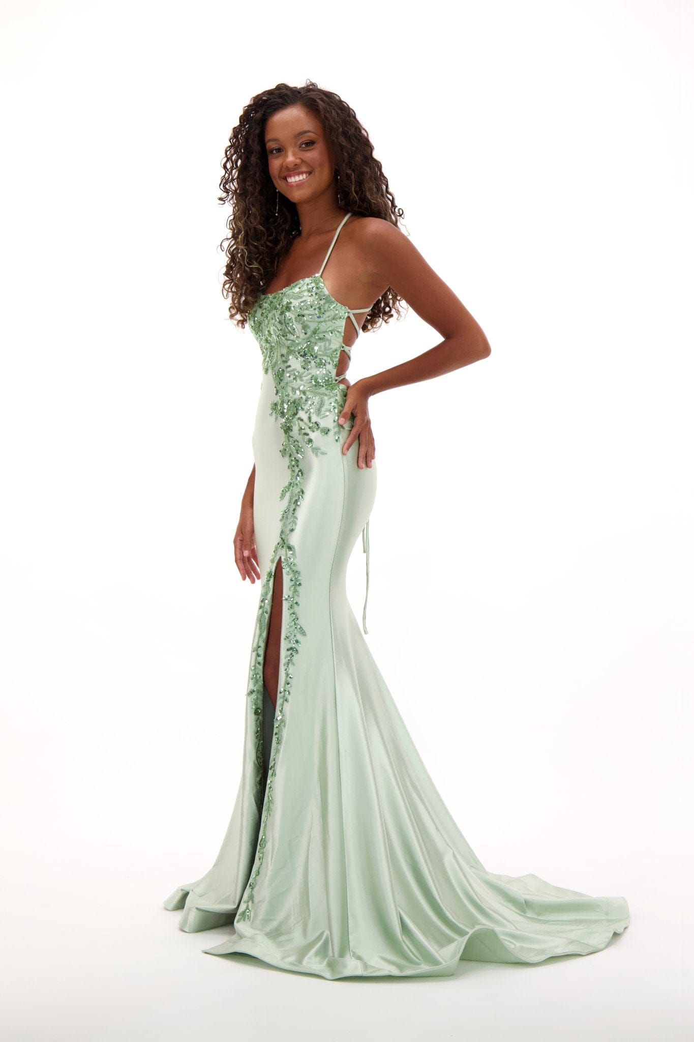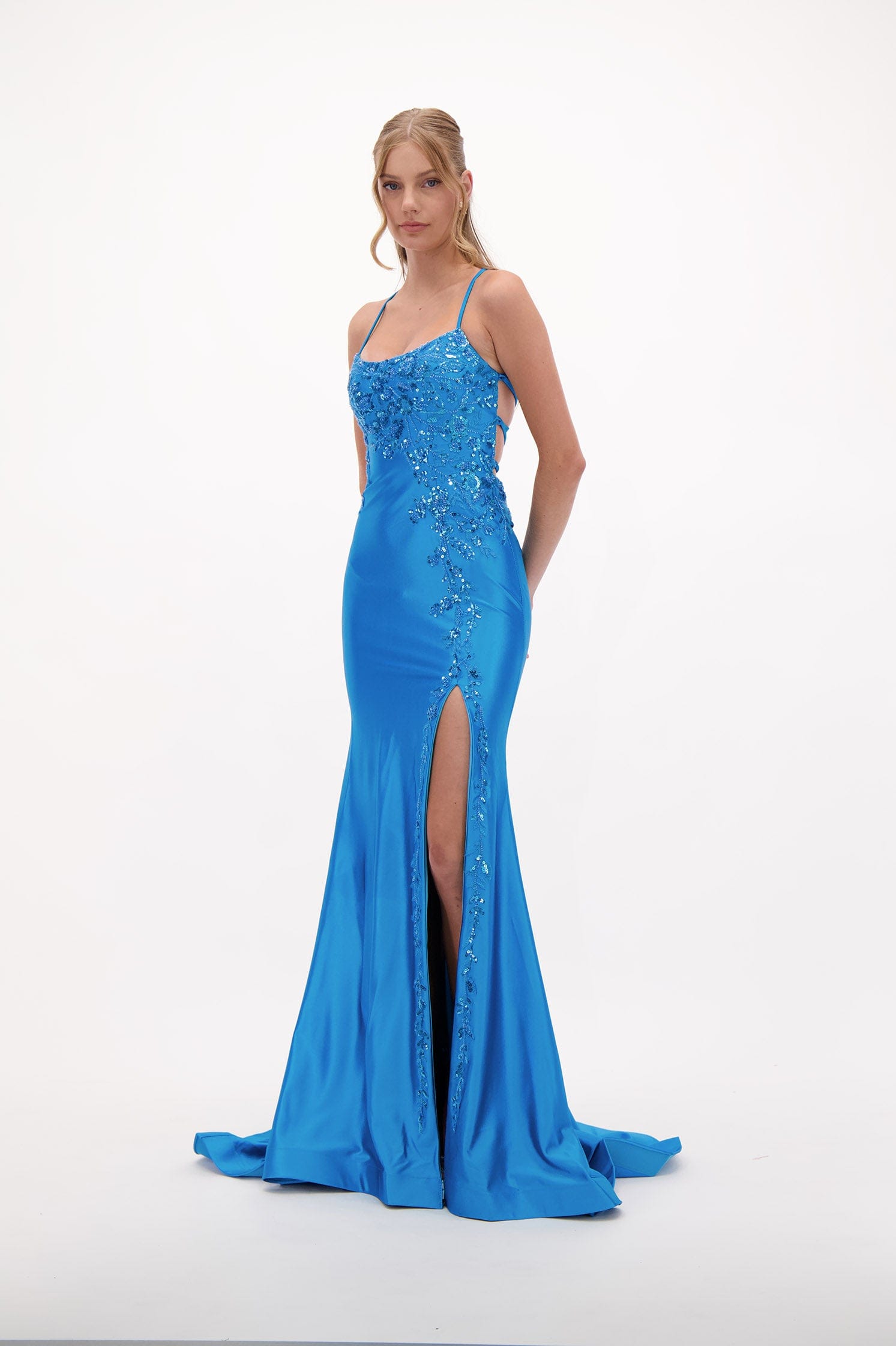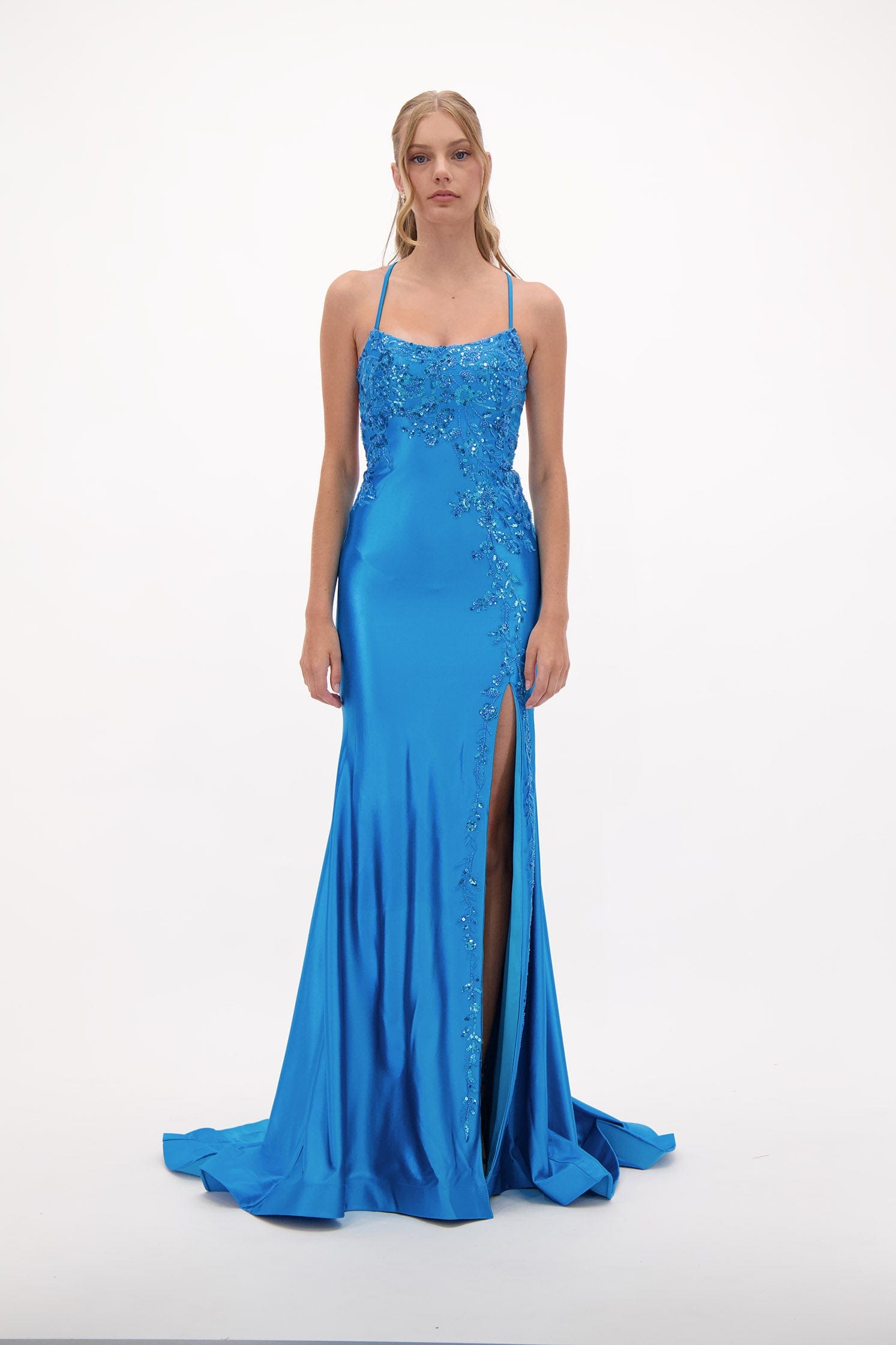 Turn heads in this satin dress featuring shimmering embellishments, a curve-skimming fit, daring slit, and flowing train. Perfect for prom or formal events.