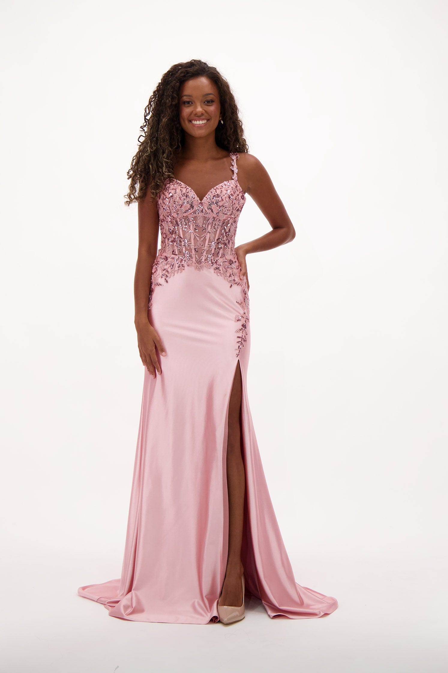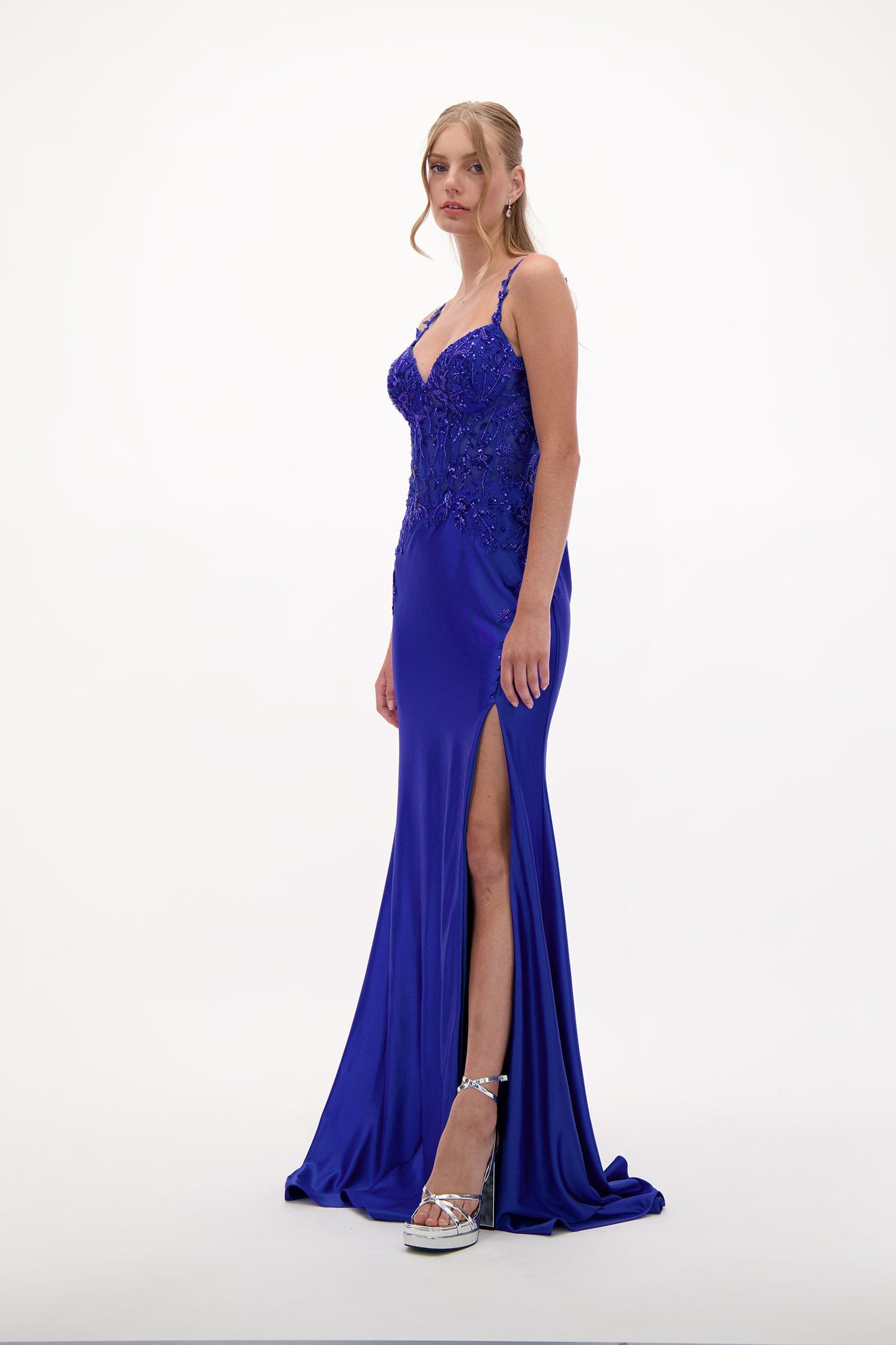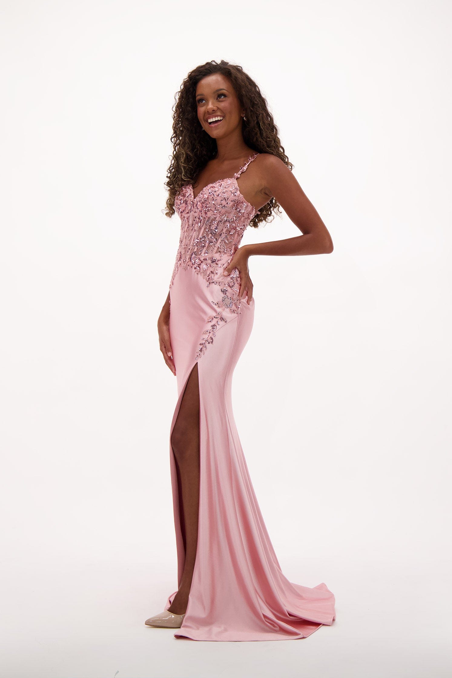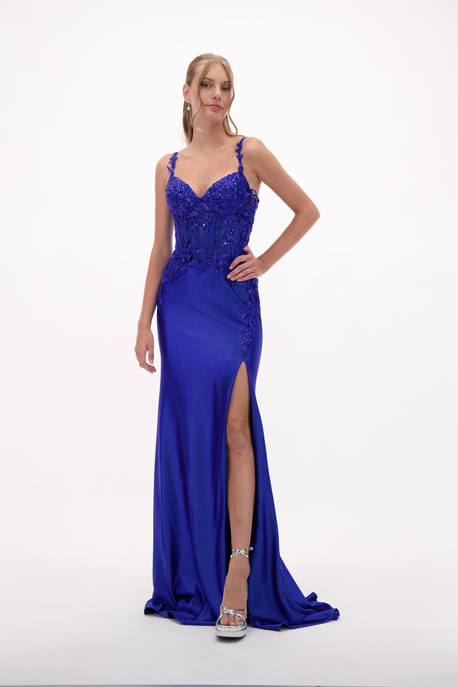 Shimmer with elegance in this embellished sweetheart satin prom dress, designed to highlight your figure with a sleek fitted silhouette. The bodice glistens with beadwork and embroidery, balanced by slim straps and a romantic sweetheart neckline. A high side slit adds just the right amount of boldness, making this gown a flawless choice for proms, pageants, or evening galas.