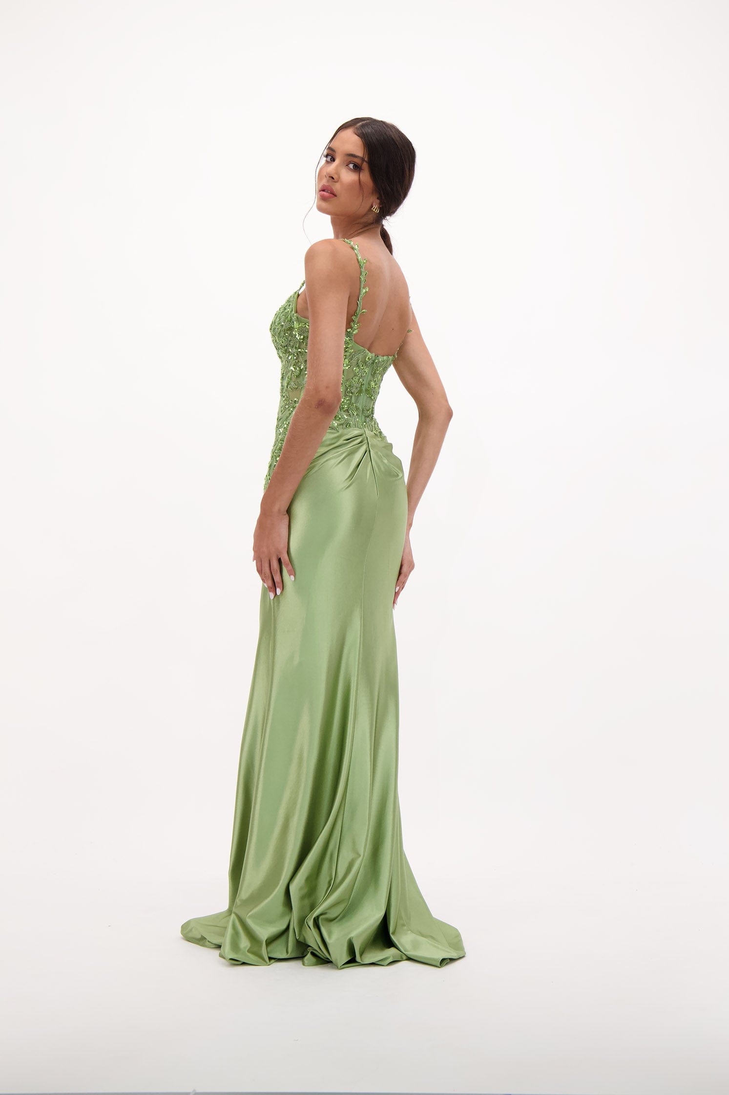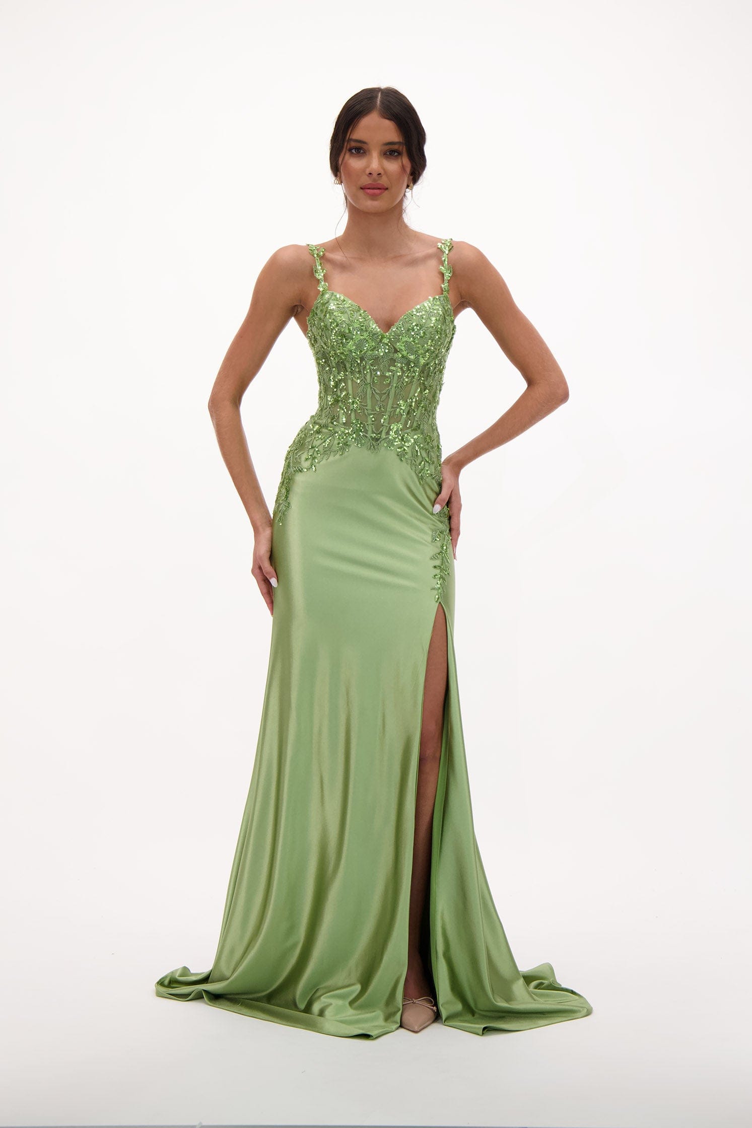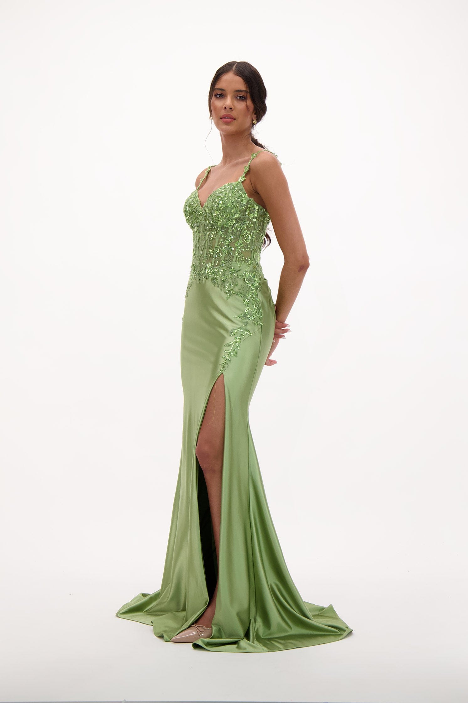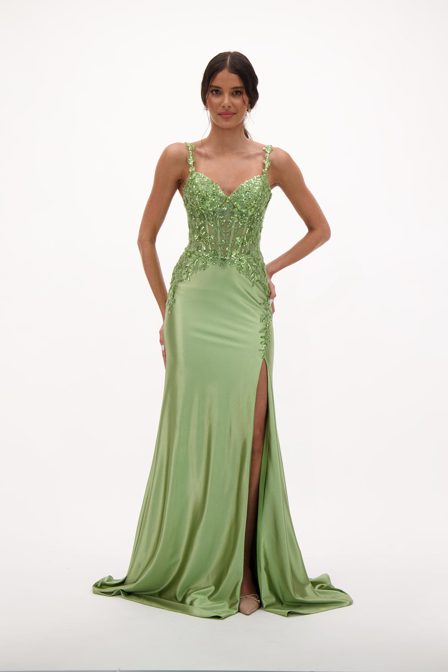 Shimmer with elegance in this embellished sweetheart satin prom dress, designed to highlight your figure with a sleek fitted silhouette. The bodice glistens with beadwork and embroidery, balanced by slim straps and a romantic sweetheart neckline. A high side slit adds just the right amount of boldness, making this gown a flawless choice for proms, pageants, or evening galas.
