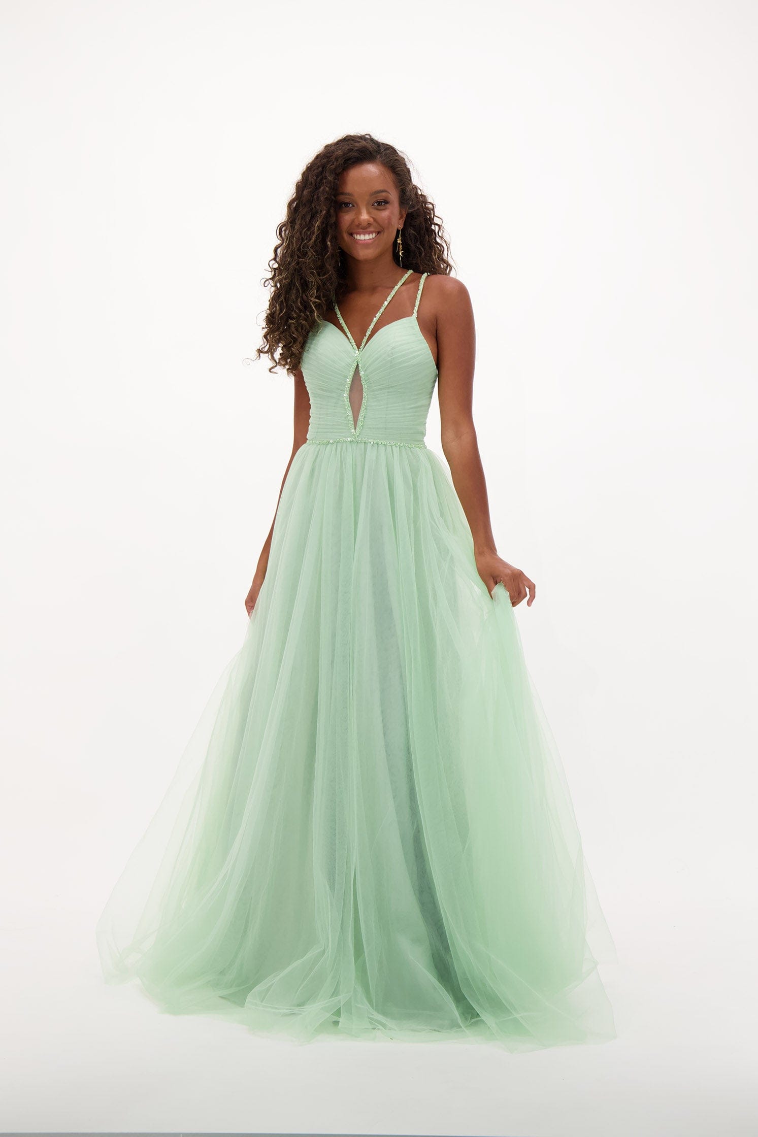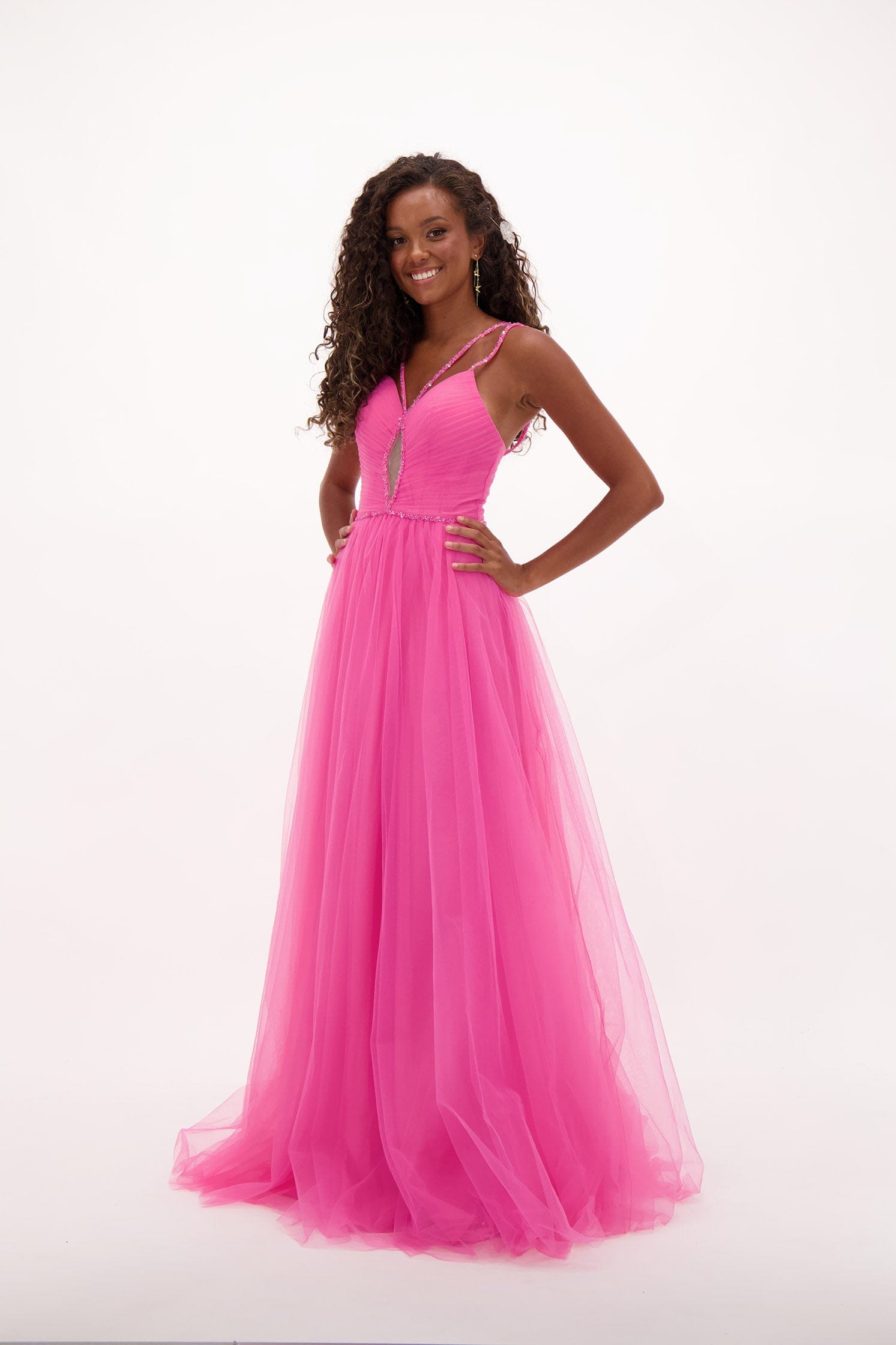 Step into prom night with confidence in this vibrant tulle gown featuring a sparkling keyhole bodice and delicate spaghetti straps. The full A-line skirt flows effortlessly, creating a dreamy silhouette perfect for dancing the night away. Chic and playful, this bold pink dress is designed for girls who want to stand out at prom, pageants, or formal occasions.