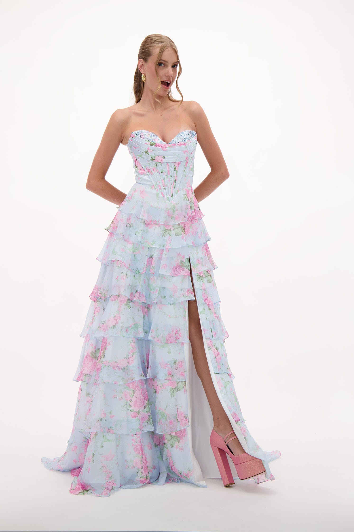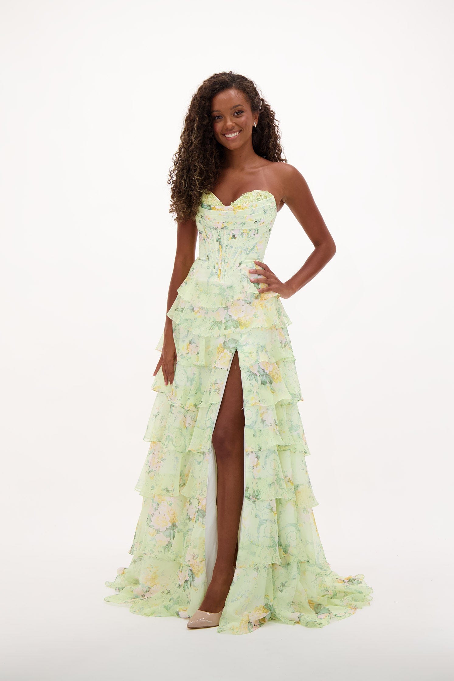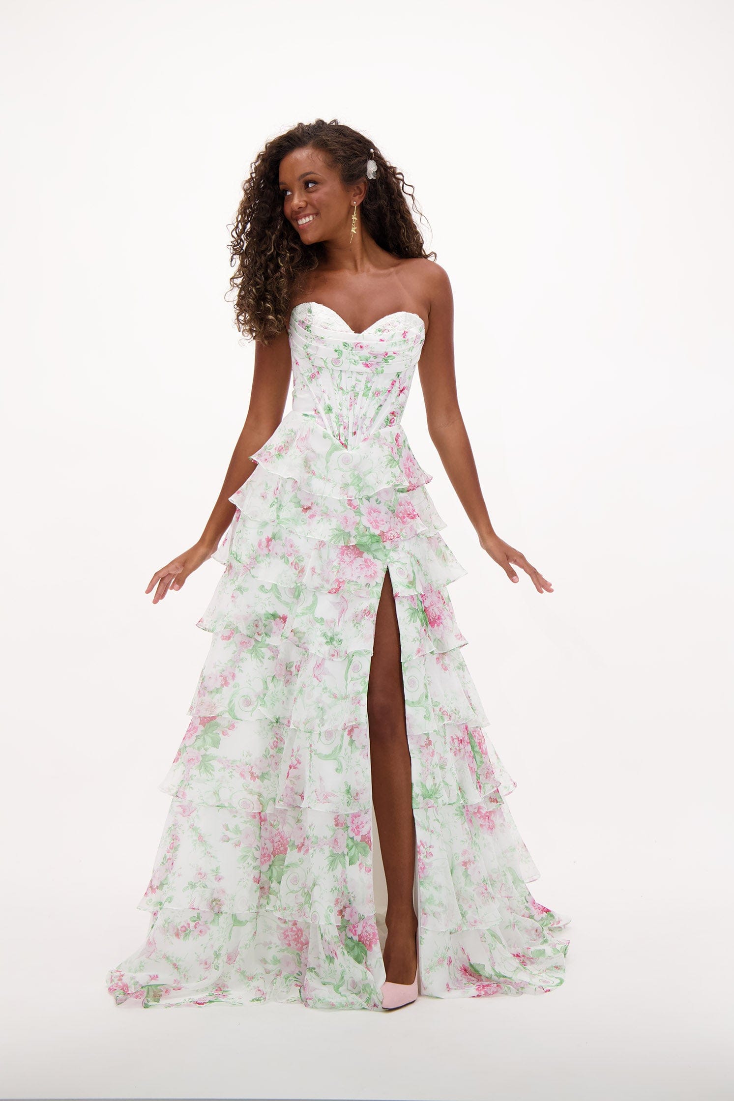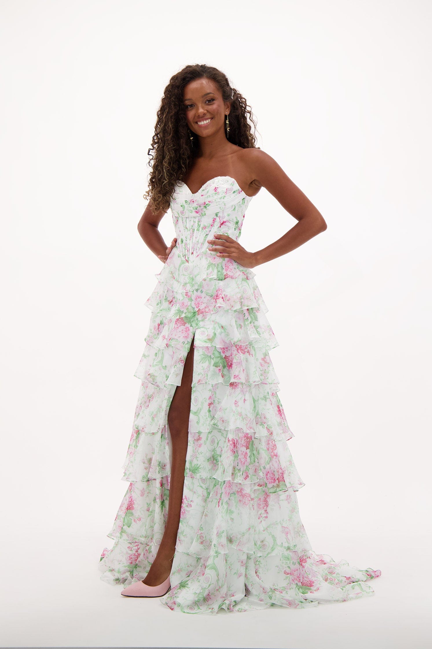 Romantic and feminine, this strapless gown features a sweetheart neckline and fitted corset bodice that highlights the waist. The cascading tiered ruffle skirt flows gracefully, while the thigh-high slit adds a flirty edge. Designed in a dreamy pastel floral print, this gown is perfect for prom, spring formals, and garden-inspired events.