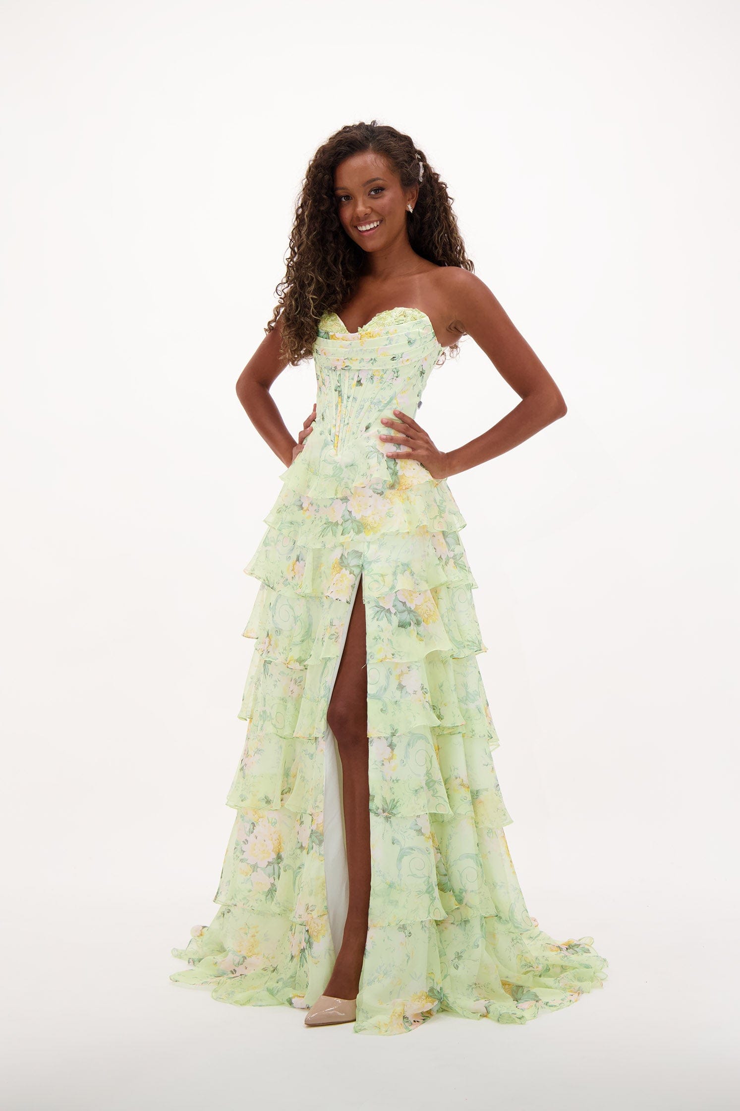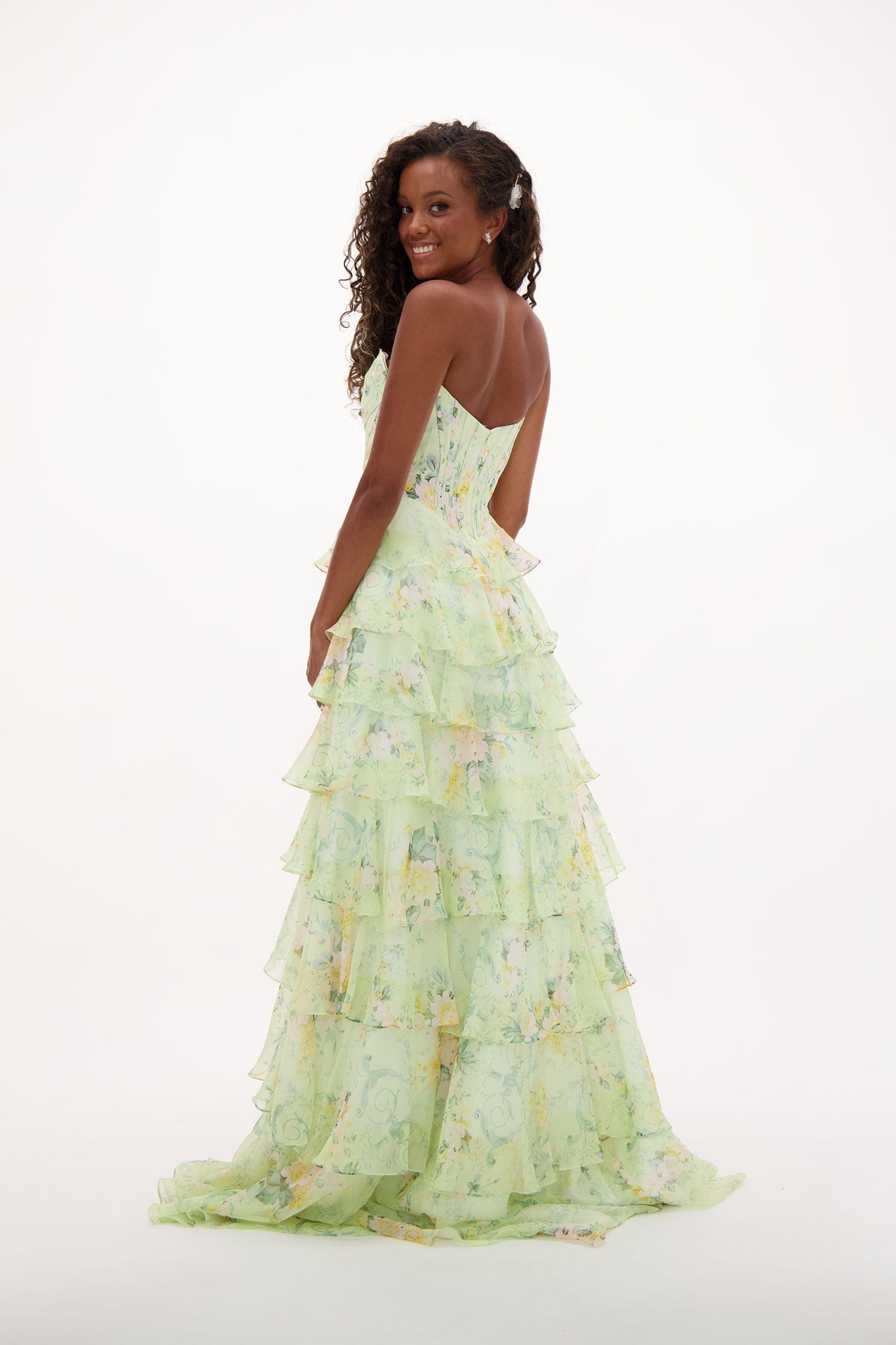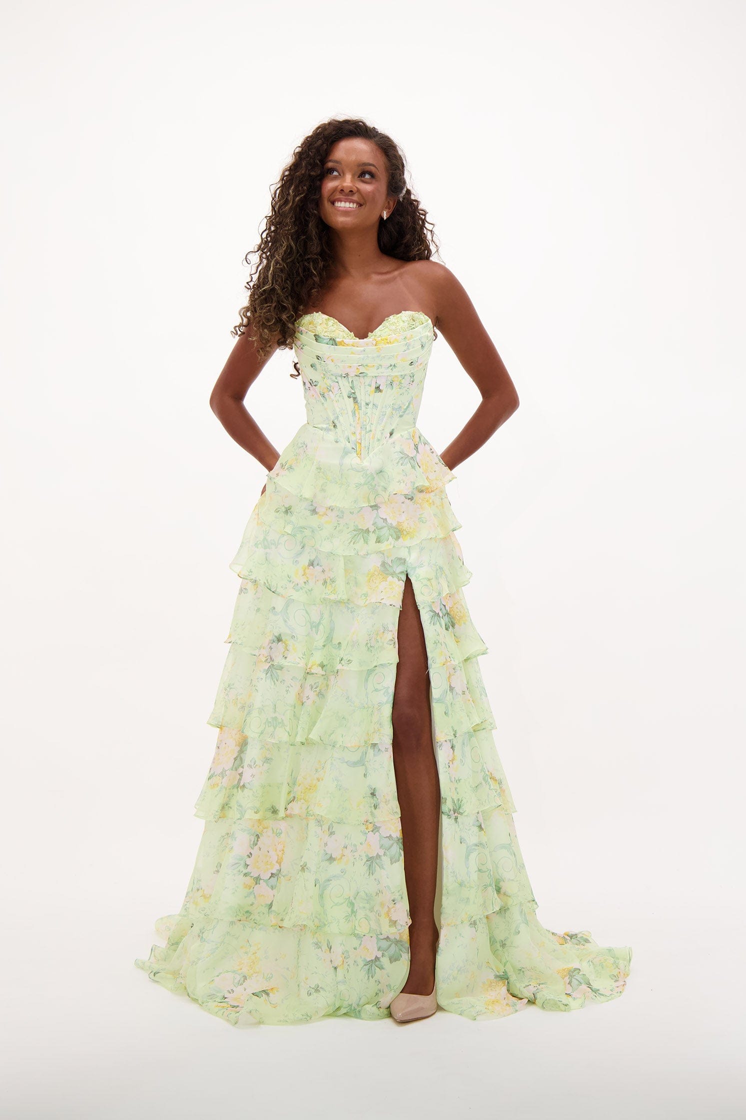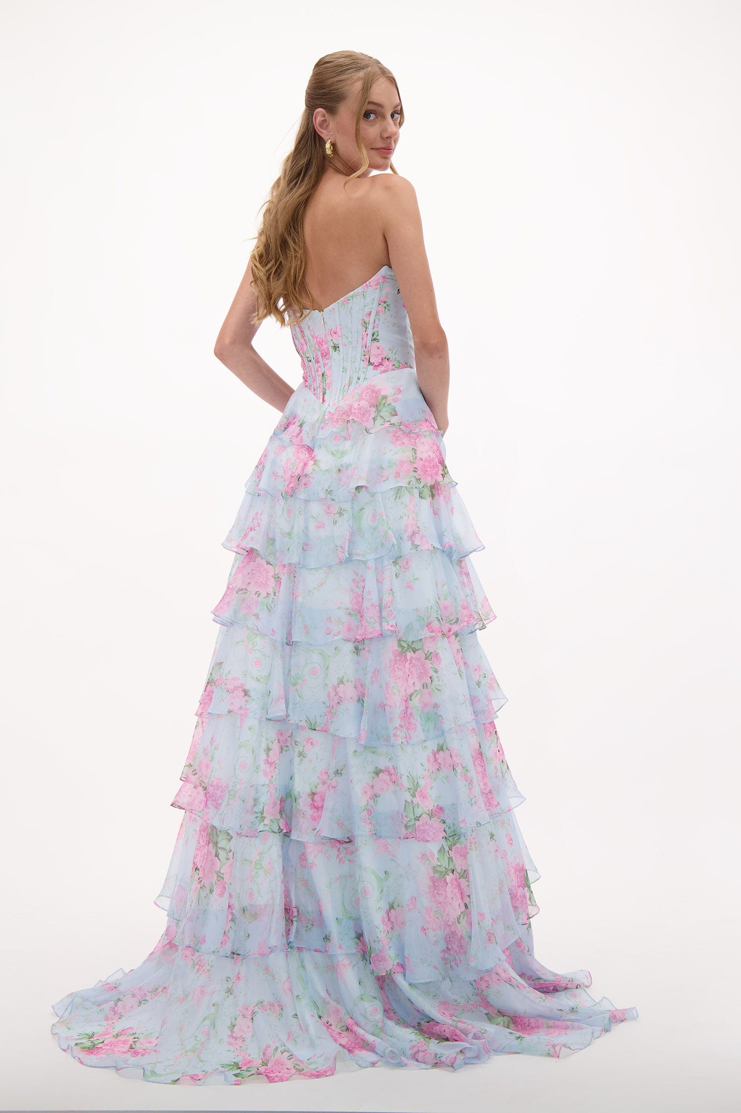 Romantic and feminine, this strapless gown features a sweetheart neckline and fitted corset bodice that highlights the waist. The cascading tiered ruffle skirt flows gracefully, while the thigh-high slit adds a flirty edge. Designed in a dreamy pastel floral print, this gown is perfect for prom, spring formals, and garden-inspired events.