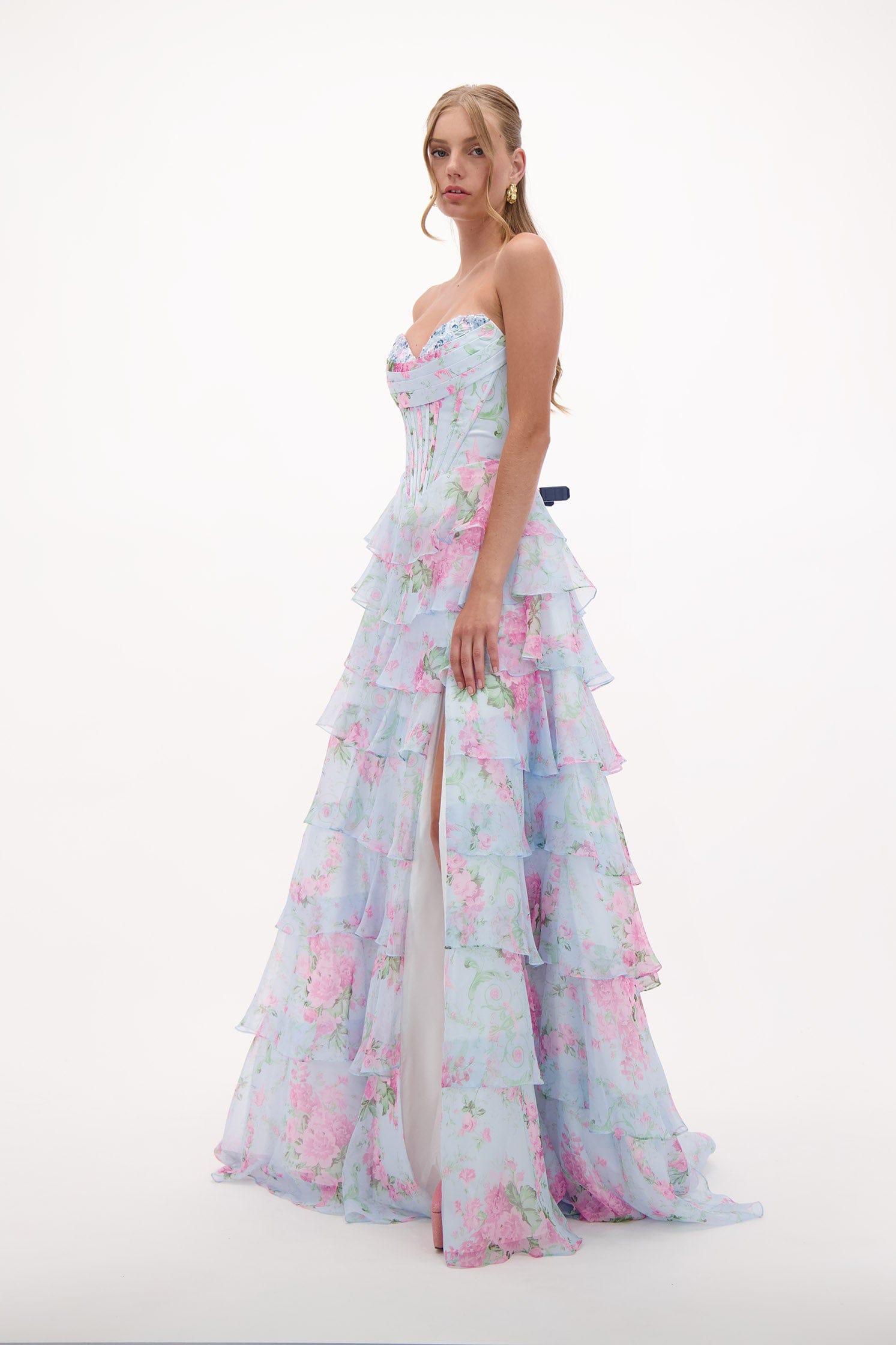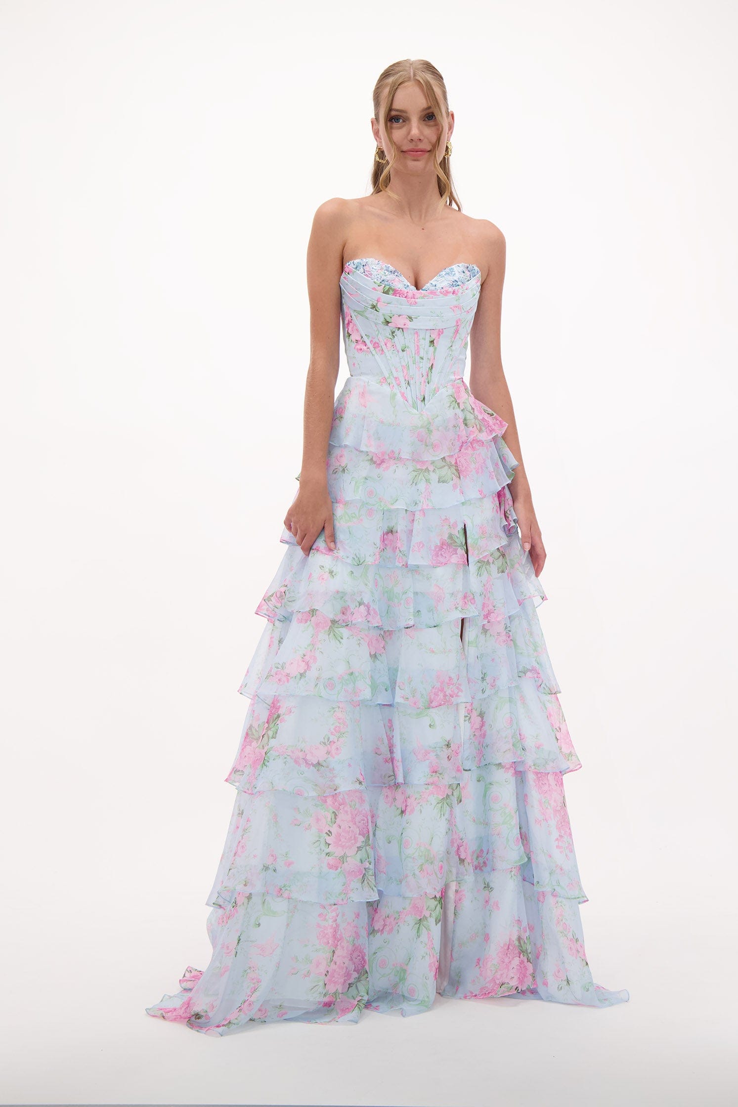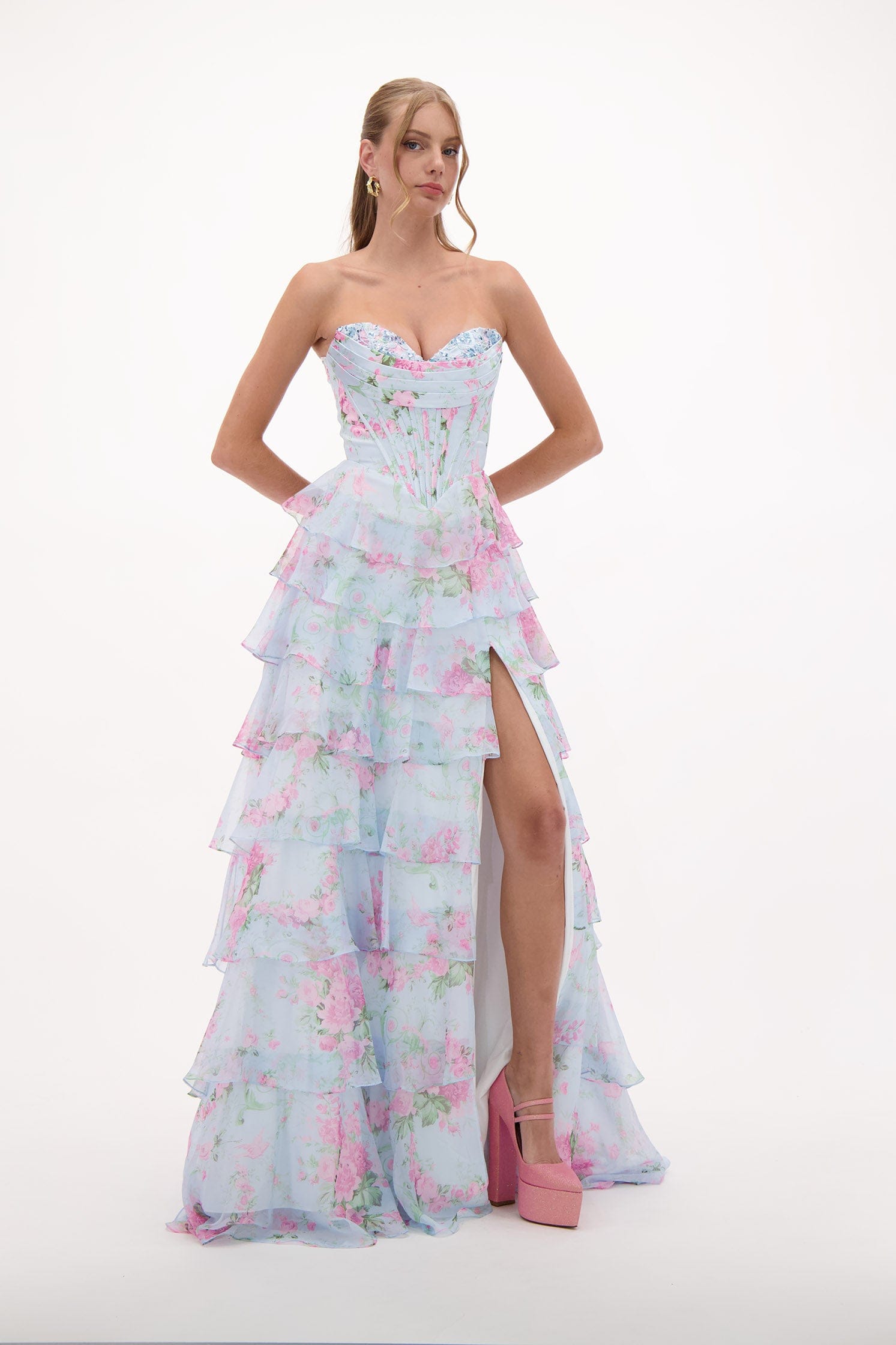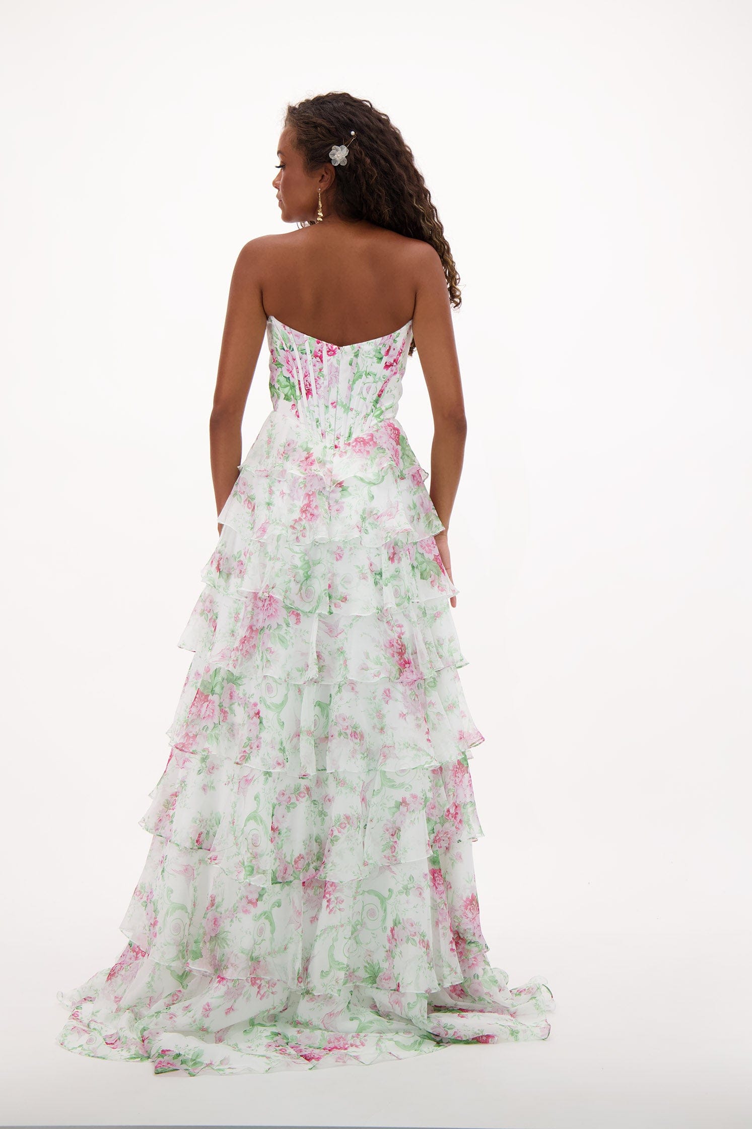 Romantic and feminine, this strapless gown features a sweetheart neckline and fitted corset bodice that highlights the waist. The cascading tiered ruffle skirt flows gracefully, while the thigh-high slit adds a flirty edge. Designed in a dreamy pastel floral print, this gown is perfect for prom, spring formals, and garden-inspired events.