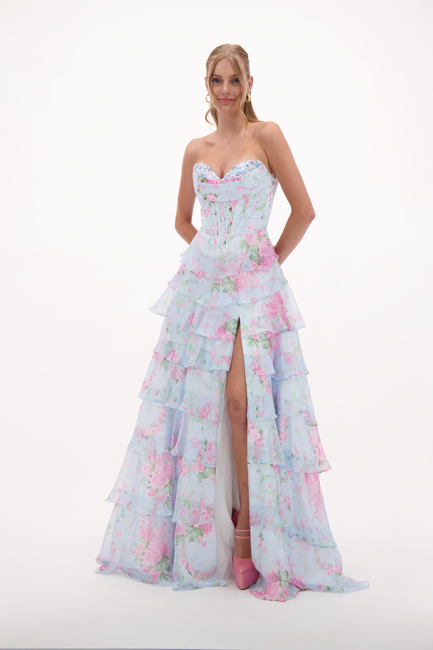 Romantic and feminine, this strapless gown features a sweetheart neckline and fitted corset bodice that highlights the waist. The cascading tiered ruffle skirt flows gracefully, while the thigh-high slit adds a flirty edge. Designed in a dreamy pastel floral print, this gown is perfect for prom, spring formals, and garden-inspired events.