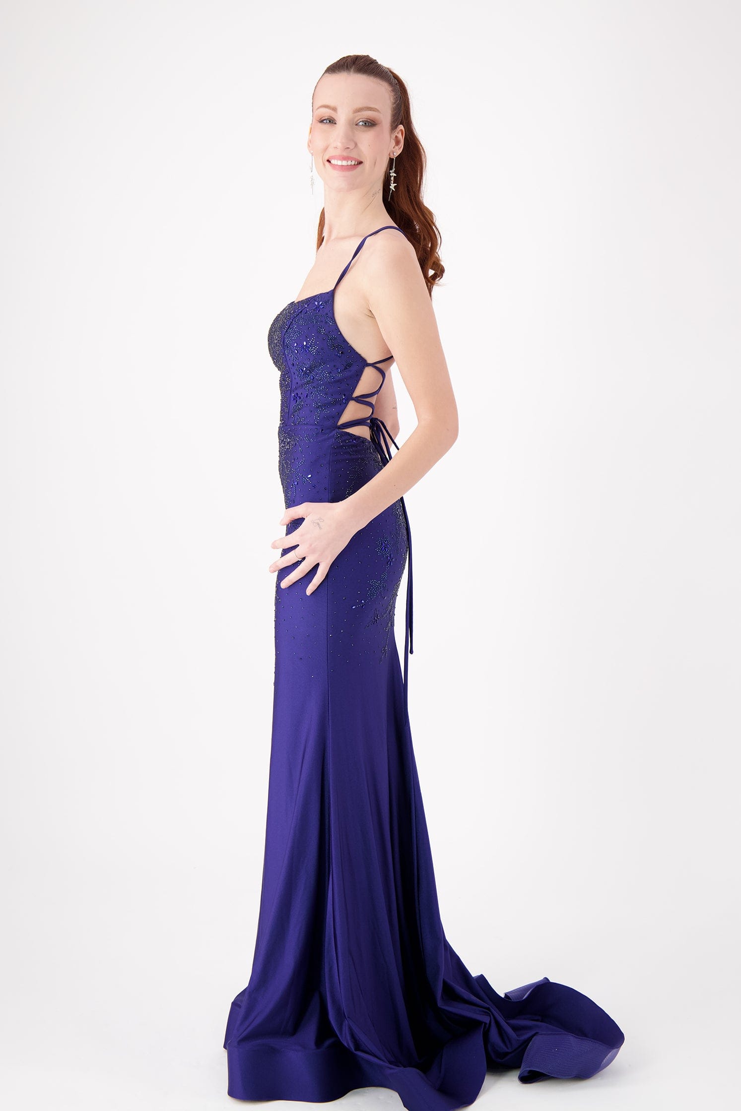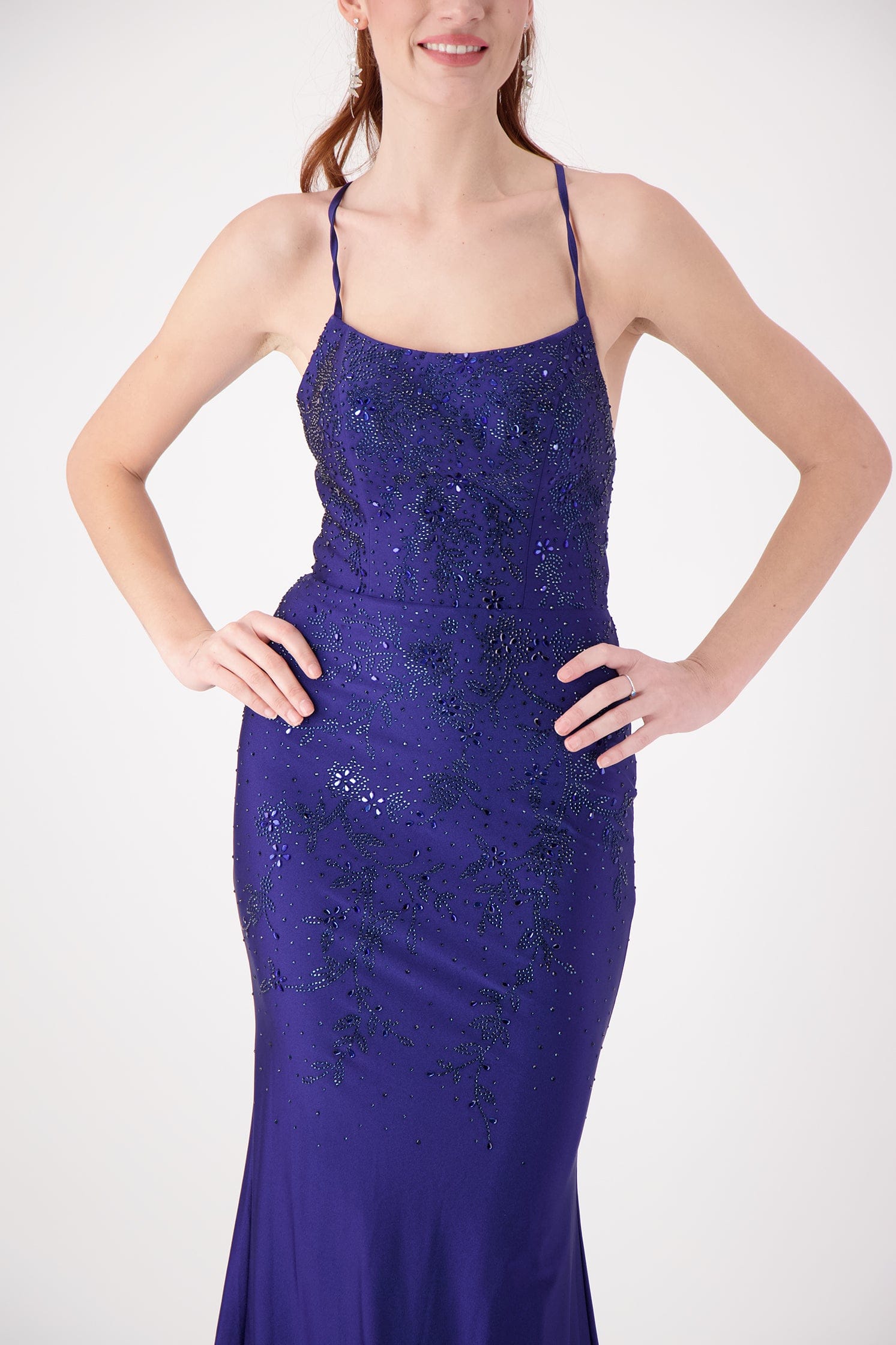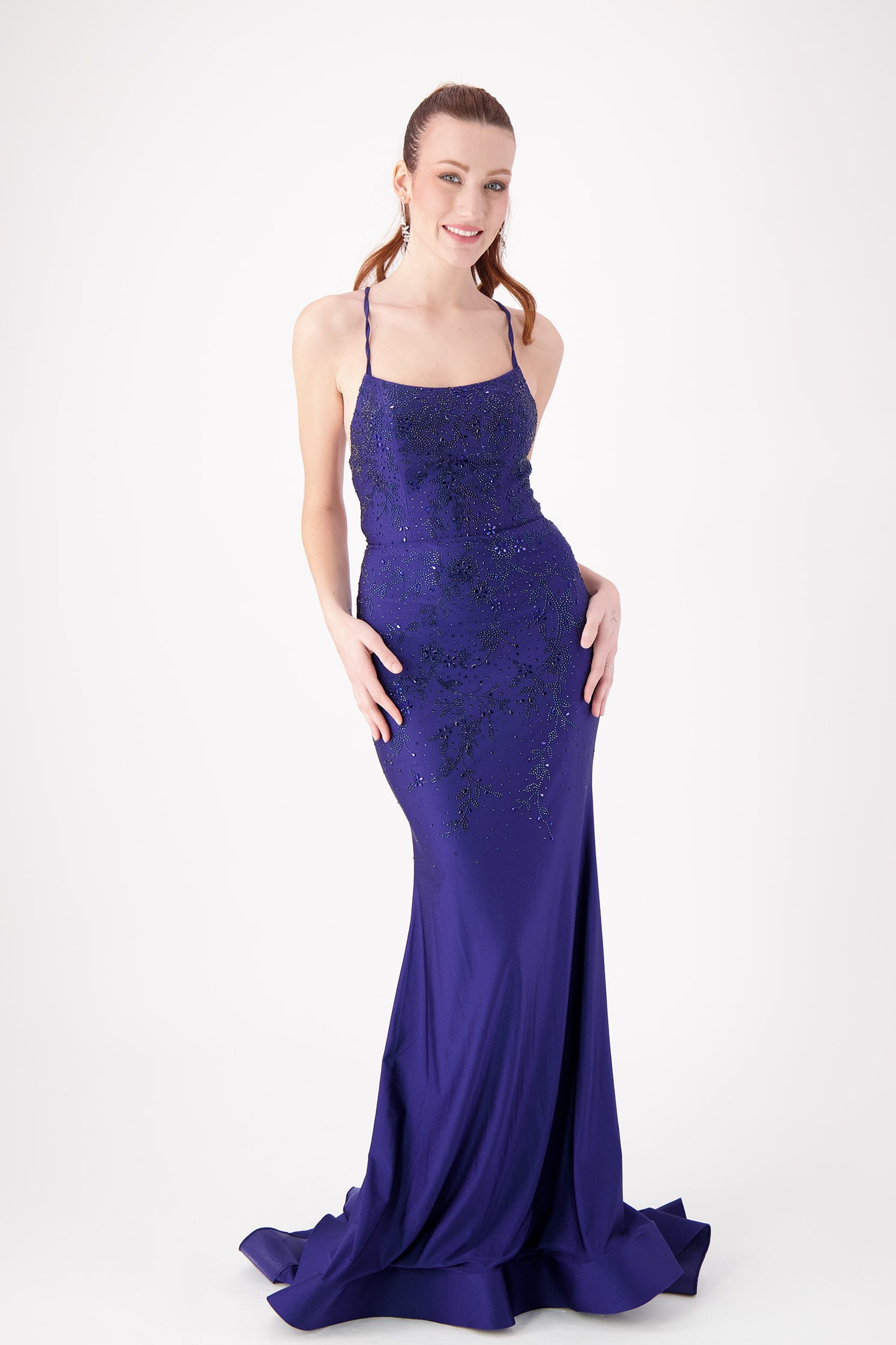 This glamorous purple gown features a sleek fitted silhouette adorned with intricate beadwork for a dazzling finish. The halter-style straps frame the neckline elegantly, while the smooth skirt extends into a soft train for added drama. Perfect for prom, evening galas, and pageants, this gown delivers sophistication with a touch of sparkle.